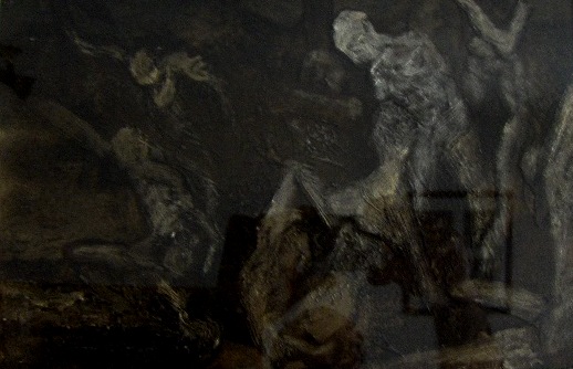 Conocimos el contenido de algunas muestras suyas producidas en Italia y de la serie estertores. Allí había plasticismo con mayor o menor logro hasta desarrollar una eficiencia de texturas, claroscuros y cromatismos y finalmente lograban una intención de figuras fantasmales que brotan del juego plástico con intención por decir algo sobre la debacle humana. Antes de ello, había producido las escenas “estertores”, de refinerías petroleras agotadas, como herrumbes industriales fantasmales dejadas por la era de la industrialización, y esto estaba resuelto en sombríos escenarios casi monocromáticos.